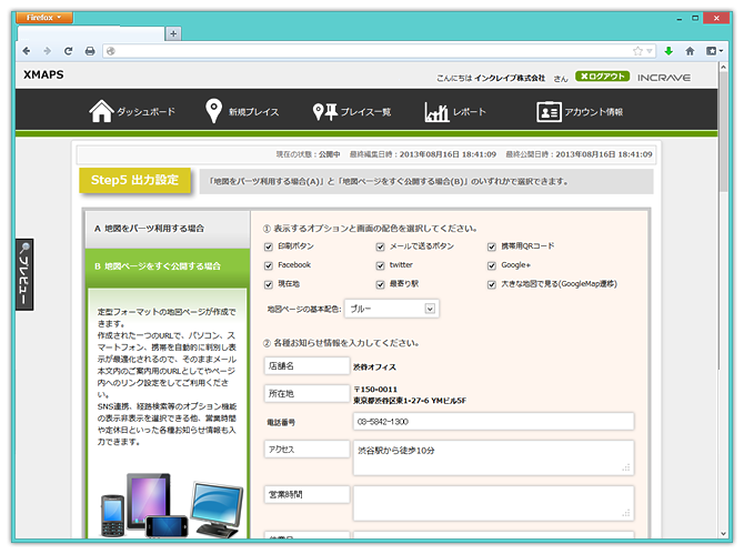 | 公開 | 地図表示 | 登録した地図を、パソコン、スマートフォン、フィーチャーフォンそれぞれに最適な形で表示することができます。 |
